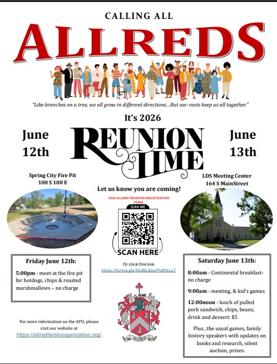 We are excited to gather once again in beautiful Spring City, Utah, for our annual Allred Family Reunion, June 12-13, 2026! This beloved tradition continues to bring our family together to celebrate our shared heritage, strengthen connections, and create memories across generations.